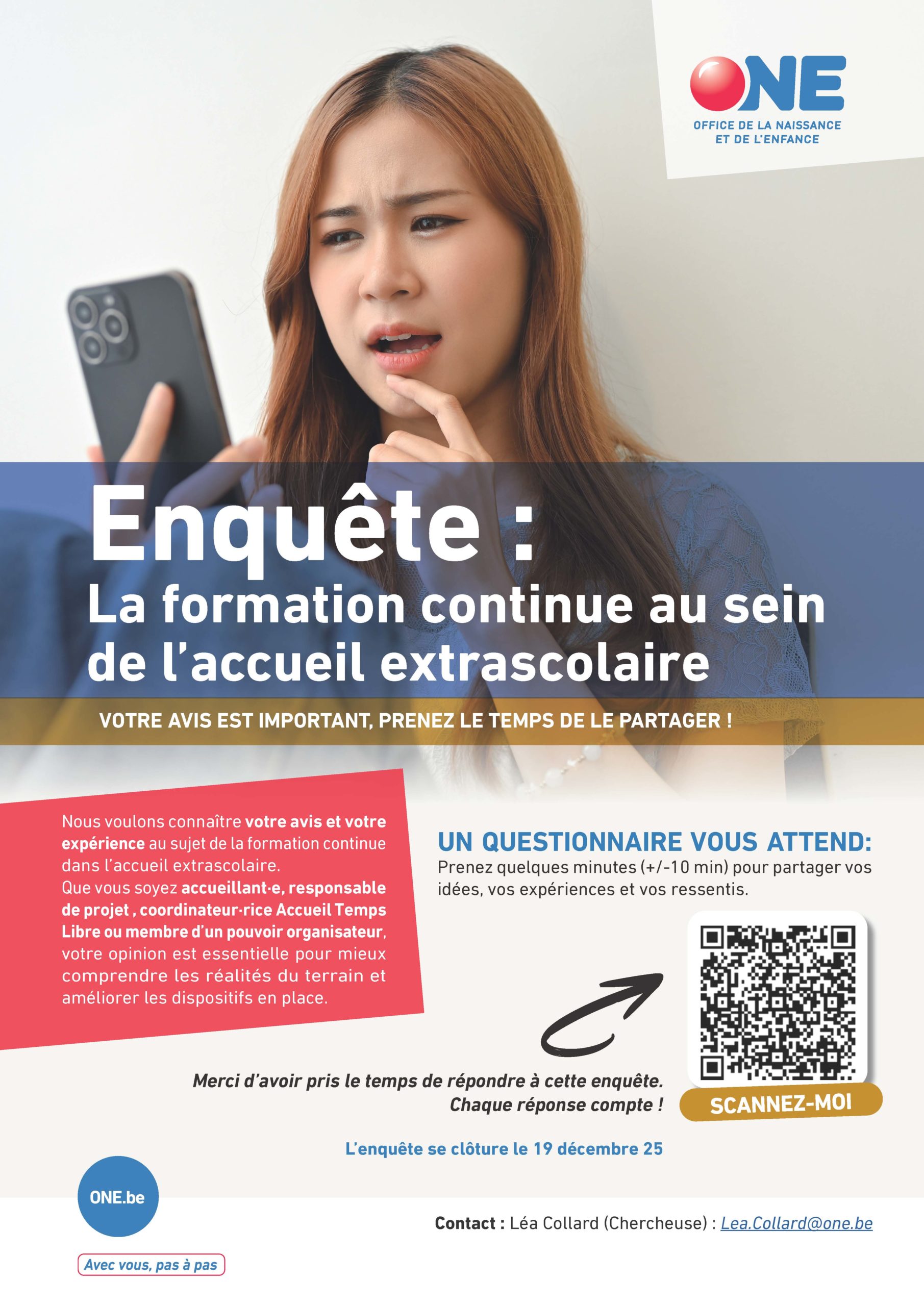 Votre collaboration est précieuse pour aider l’ONE à mieux comprendre les enjeux liés à la formation continue dans le secteur. D’avance un grand merci !